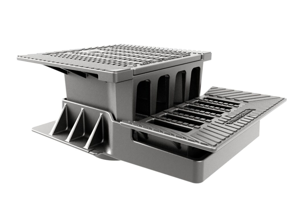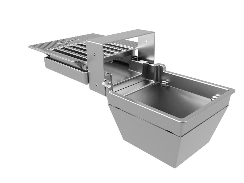 Pekuma Växtbädds-kit – Ett paket med noggrant utformade komponenter som tillsammans ger effektiv vattenfördelning, infiltration och naturlig rening. Växtbädds-kit består av fyra komponenter. 1. Horisontellt gatugaller 470x490mm. 2. Bottendel gatugaller, 3. Bygel över kantstenssläpp (anpassas till kantstenens bredd). 4. Spridningskar/Sandfång 450x410x300mm
